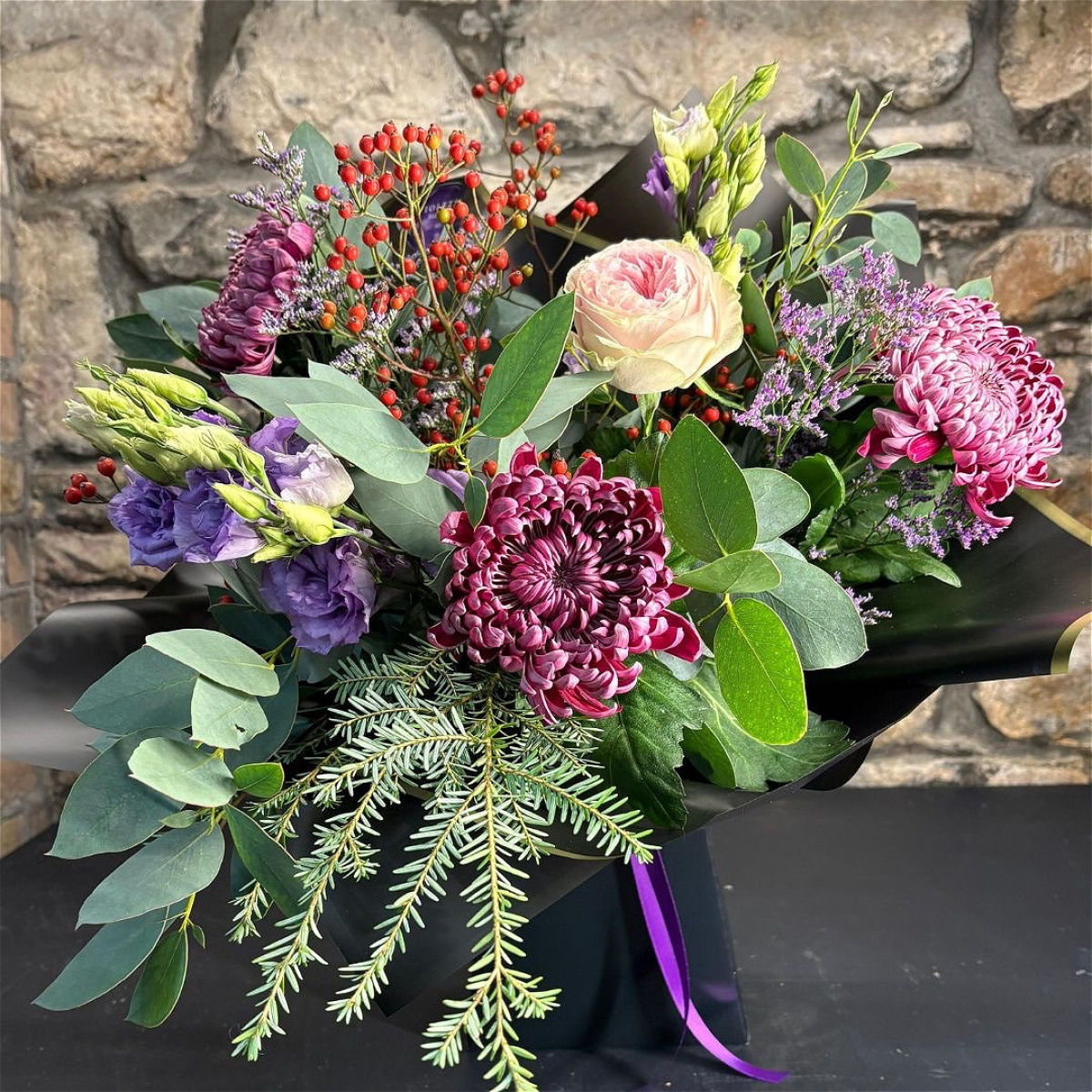 A soft yet luxurious winter mix, full of plum tones, blush petals and seasonal texture. This bouquet blends mulberry chrysanthemums, lisianthus, winter berries and fresh evergreens for a look that feels elegant, cosy and beautifully festive.