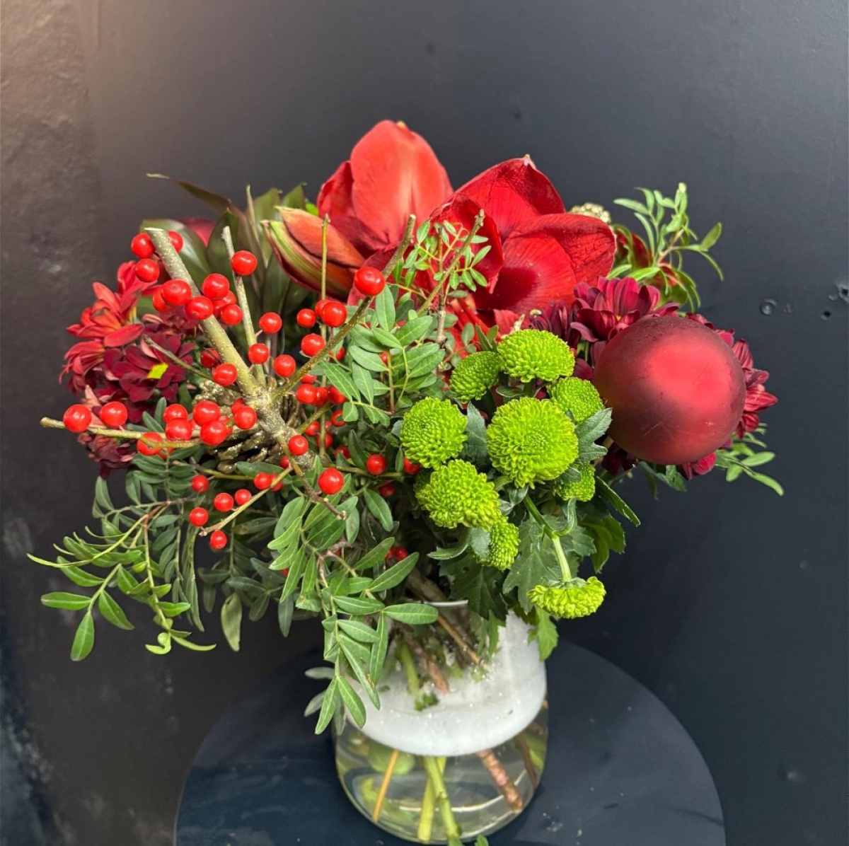 Bring a little magic home this Christmas with Violet's beautifully crafted festive bouquet. Bursting with rich seasonal reds, fresh winter greens and playful pops of bright berry tones, this design is made to warm any space. Featuring elegant red amaryllis, vibrant chrysanthemums, glossy seasonal berries, and textured festive foliage, its the perfect balance of traditional and modern style.