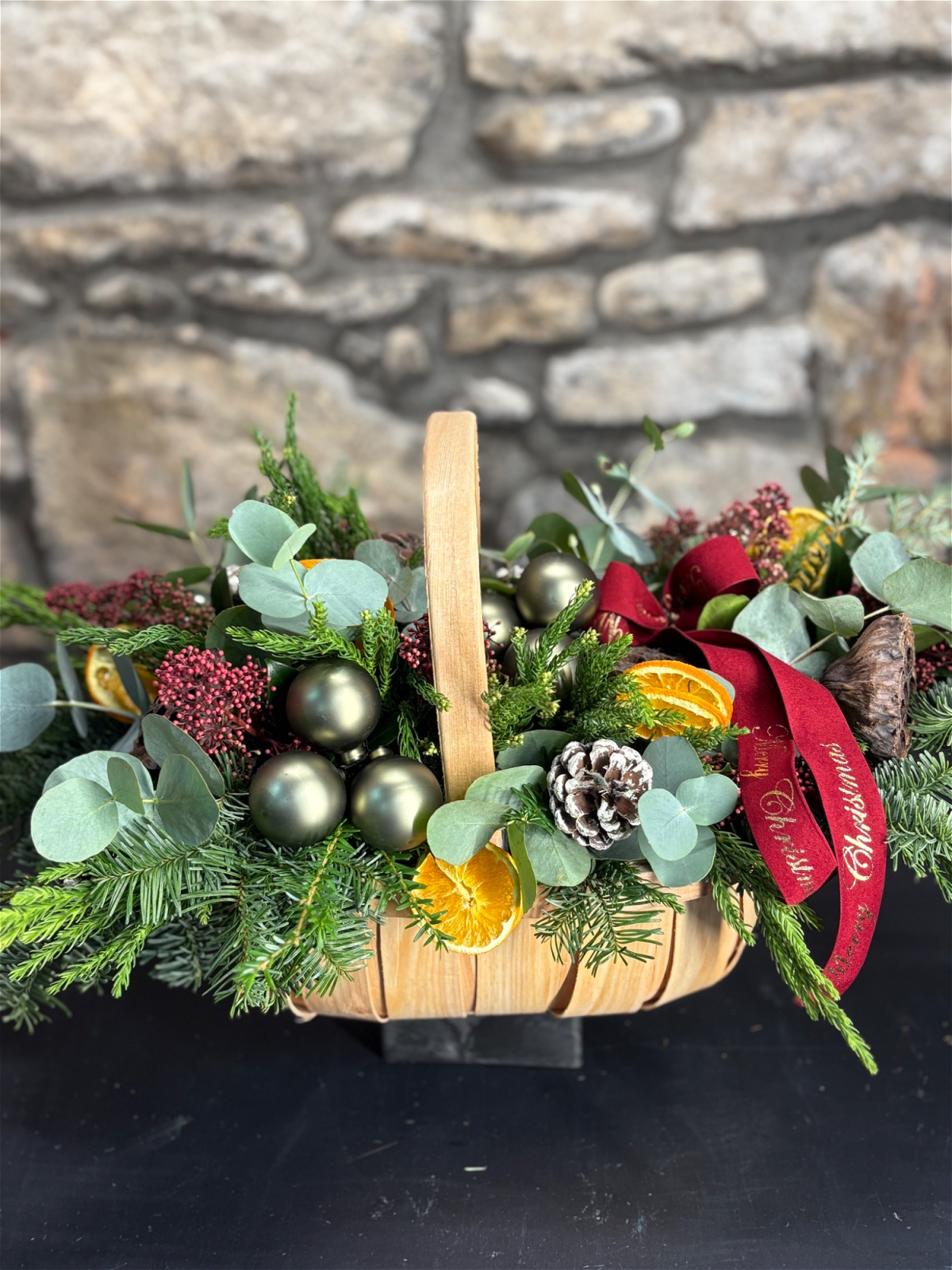 Handcrafted in Charlestown and delivered across Mayo, Sligo and Roscommon, our Festive Evergreen Basket is the ultimate Christmas gift for anyone who loves rich, natural winter décor. Packed with fresh Irish evergreens, eucalyptus, festive berries, pinecones, gold baubles and dried oranges, this lush seasonal arrangement brings instant warmth and luxury to any home.