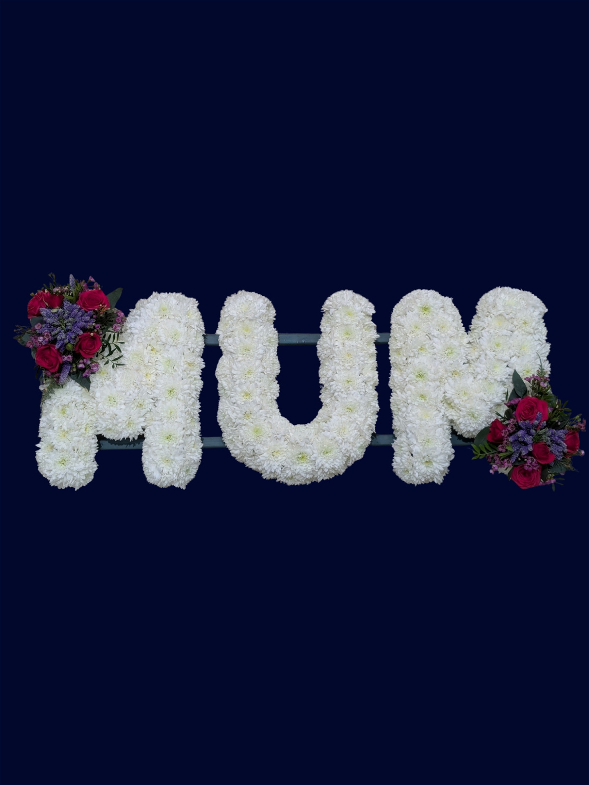 A deeply personal floral tribute, Mum is designed to honour a mother with love, gentleness and grace. Crafted in classic white chrysanthemums, the letters form a timeless expression of devotion and remembrance.