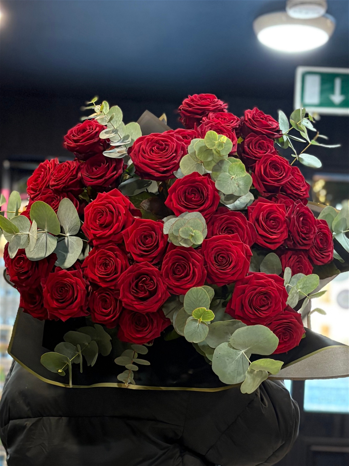 Forty velvety red roses, hand-tied and finished with soft eucalyptus for a timeless, luxurious look. This bouquet is designed to make a statement, generous, romantic and unapologetically indulgent.
