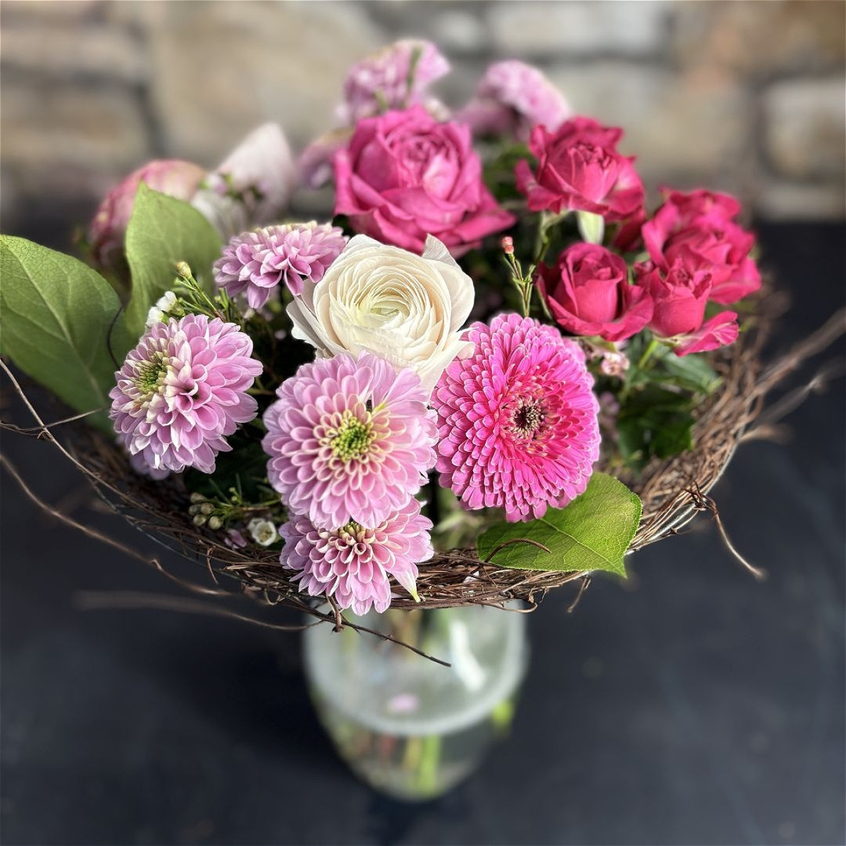 A soft, romantic arrangement designed to feel warm, comforting, and full of gentle beauty. Delicate seasonal blooms are nestled together in a natural woven frame, creating a look that feels lovingly gathered and effortlessly charming.